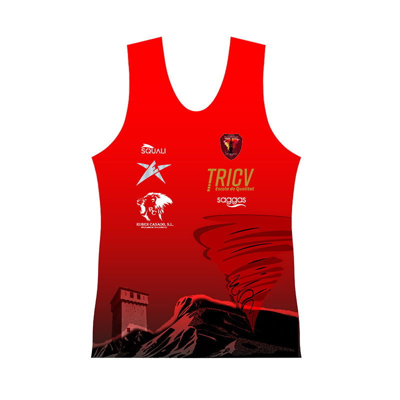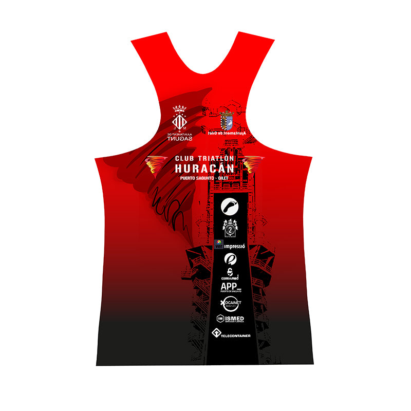 Camiseta sin mangas Colección Exclusiva Club Triatlón Huracán. Tejido ultraligero microperforado para la mejor transpiración. Densidad del material 80gr. Tejido especial diseñado para atletismo y deportes de carrera.